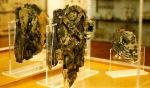 Τα τέσσερα θραύσματα του μηχανισμού των Αντικυθήρων, όπως εκτίθενται στην προθήκη του Εθνικού Αρχαιολογικού Μουσείου στην Αθήνα.