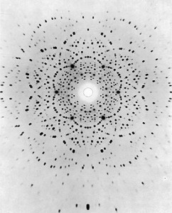 Με φωτογραφίες περίθλασης ακτίνων-Χ από ένα κρύσταλλο (βηρυλλίου) αποκαλύπτεται η συμμετρία διαφόρων κρυστάλλων. Τα μαύρα σημεία σε μια τέτοια εικόνα δεν είναι τα άτομα, άλλα ένα “σχέδιο” που δημιουργείται από τα άτομα του κρυστάλλου.