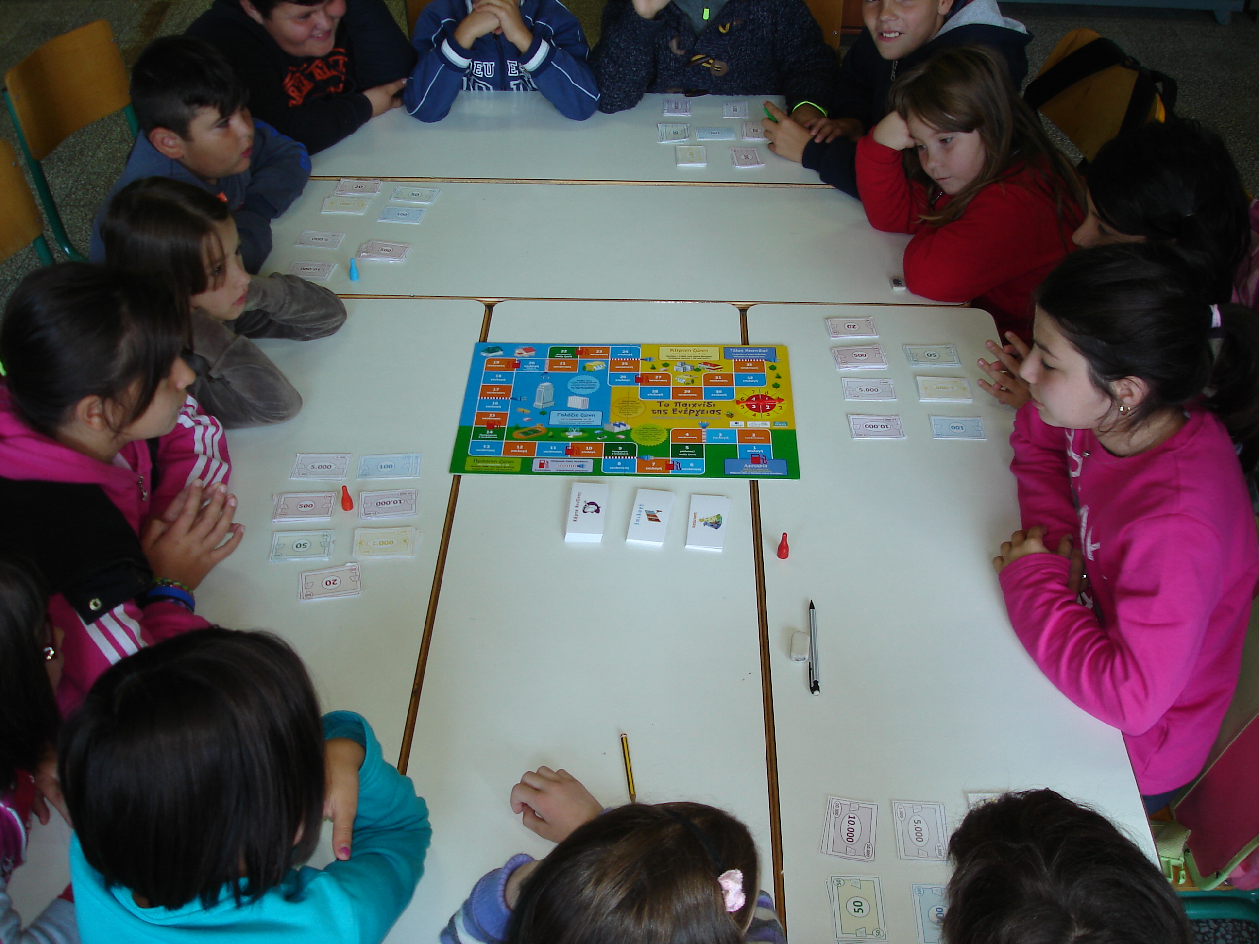 Η πρώτη στάση έγινε στο Πετρίτσειο Γυμνάσιο. Λόγω ιώσεων, παρόντες ήταν τα 39 από τα 47 παιδιά της πρώτης Γυμνασίου, οπότε άμεσα αποφασίστηκε στο εργαστήριο να συμμετέχουν και τα τρία τμήματα της πρώτης. Αφού βρέθηκε ο νέος χώρος που θα μας φιλοξενούσε και μεταφέρθηκαν οι αναγκαίες επιπλέον καρέκλες πέσαμε με τα μούτρα στο παιχνίδι. Οι μαθητές με περισσή ζωντάνια και κέφι έπιασαν άμεσα το νόημα, μοιράστηκαν ρόλους και καθήκοντα και έκαναν, έστω σε επιτραπέζιο παιχνίδι, επιλογές που θα κληθούν να κάνουν στην πραγματικότητα, σε λίγα χρόνια.