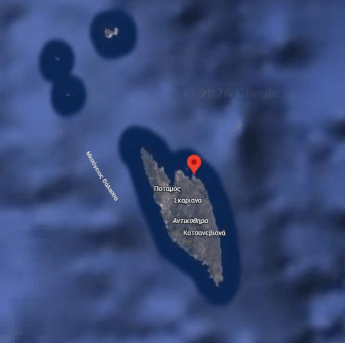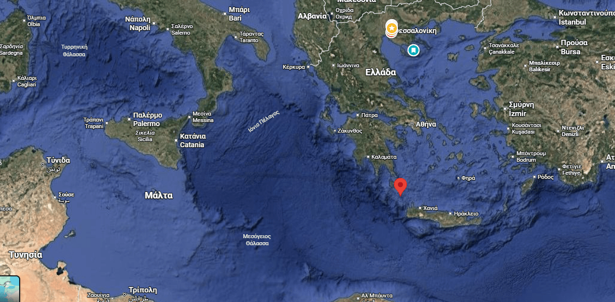 Η θέση του ναυαγίου από Google Maps. Στην πρώτη εικόνα διακρίνεται η Σύμη, ανατολικά της Ρόδου και οι ακτές της Τυνησίας. Στη δεύτερη είναι σημειωμένη η θέση του ναυαγίου στο νησί των Αντικυθήρων.