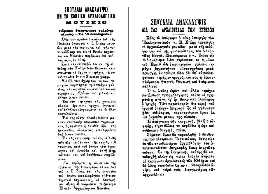 Στην Αθήνα καταγράφονται όλες οι λεπτομέρειες της επιχείρησης στην «Αρχαιολογική εφημερίδα». Αφού περιγραφούν όλα τα αντικείμενα που μεταφέρθηκαν στο Μουσείο αναφέρεται ένα «περίεργο εύρημα, ένα χάλκινο μηχάνημα που περιέχει πολλούς χάλκινους τροχούς, που οι περισσότεροι είναι εξαιρετικά λεπτοί και μοιάζουν με ωρολογιακό μηχανισμό. Ο μηχανισμός βρίσκεται σε τετράγωνη μάλλον ξύλινη θήκη που επίσης περιέχει μολύβδινα φύλλα με γράμματα πολύ μικρών διαστάσεων που πιθανότατα είναι οι οδηγίες χρήσης. Μάλλον πρόκειται για αστρονομικό όργανο. Τα γράμματα αν και είναι δύσκολο να διαβαστούν αντιστοιχούν στον 1ο αιώνα π.Χ. Το αντικείμενο παραμένει όπως ανελκύστηκε από το βυθό καθώς ο καθαρισμός του θα το κατέστρεφε εντελώς». Στην εικόνα 14 του συγκεκριμένου εντύπου φαίνεται το «περίεργο μηχάνημα» και σύμφωνα με την περιγραφή φαίνονται και οι επιγραφές (!!)