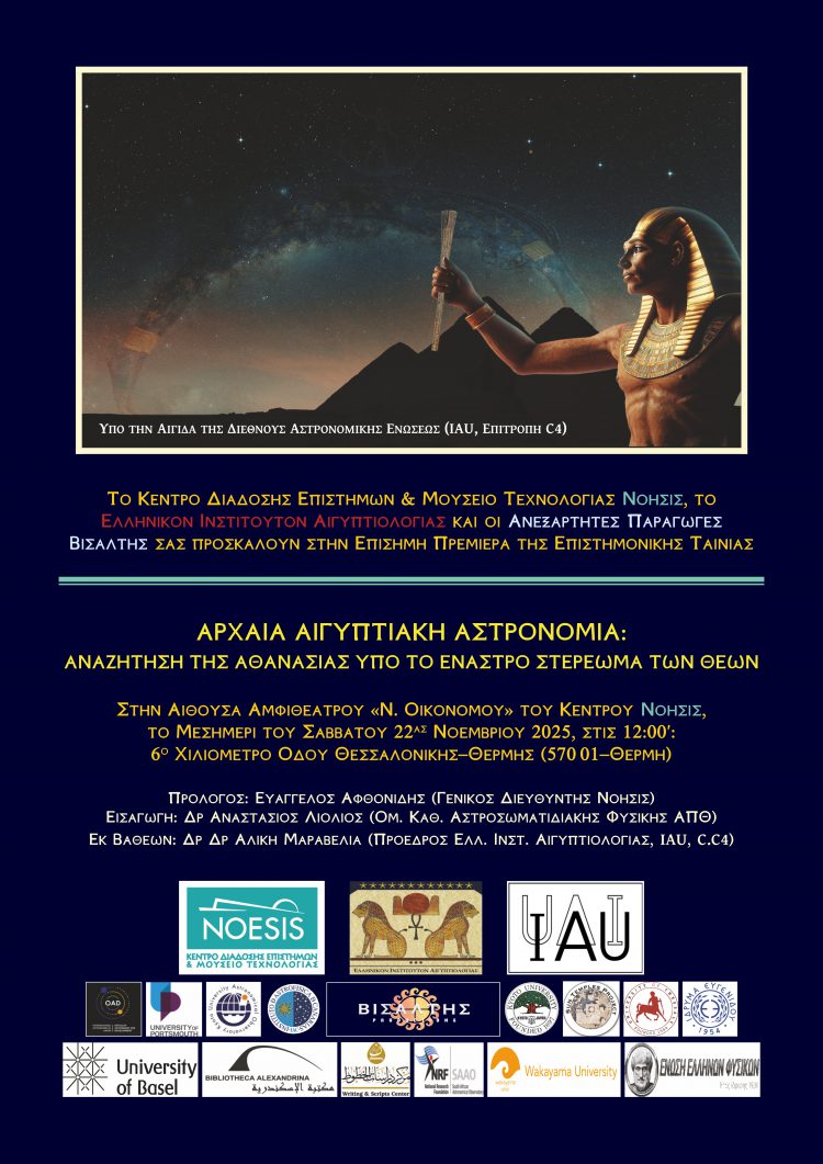 Το ΝΟΗΣΙΣ και το Ελληνικό Ινστιτούτο Αιγυπτιολογίας παρουσιάζουν την πρεμιέρα της ταινίας «Αρχαία Αιγυπτιακή Αστρονομία: Αναζήτηση της Αθανασίας υπό το Έναστρο Στερέωμα των Θεών», που θα πραγματοποιηθεί το Σάββατο 22 Νοεμβρίου 2025, στις 12:00 το μεσημέρι, στο Αμφιθέατρο του ΝΟΗΣΙΣ.