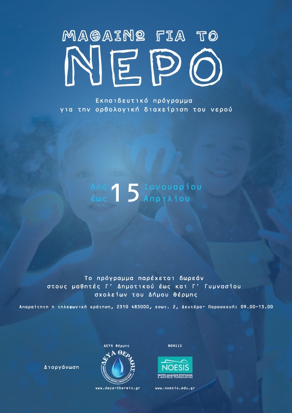 Η Δ.Ε.Υ.Α. Θέρμης, σε συνεργασία με το ΝΟΗΣΙΣ, διοργανώνει ένα εκπαιδευτικό πρόγραμμα για την ορθολογική διαχείριση του νερού, του πολύτιμου αγαθού της φύσης, που απευθύνεται στους μαθητές των σχολείων του Δήμου Θέρμης.