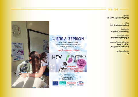 095 - 096 σχολείο 1ο ΕΠΑΛ Σερβίων Κοζάνης τίτλος Ιοί. Οι αόρατοι εχθροί διευθυντής Κυριάκος Τσολακίδης υπεύθυνος έργου Παρασκευή Βλαχάβα συνεργαζόμενοι καθηγητές Κώστας Ηλίας Δεληγιάννη Καλλιόπη αριθμός μαθητών 28
