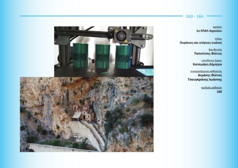 163 - 164 σχολείο 1ο ΕΠΑΛ Αγρινίου τίτλος Ουράνιες και επίγειες εικόνες διευθυντής Παπούτσης Φώτιος υπεύθυνος έργου Κατσιμάρη Δήμητρα συνεργαζόμενοι καθηγητές Δημάκης Φώτιος Τσουγκράνης Ιωάννης αριθμός μαθητών 100