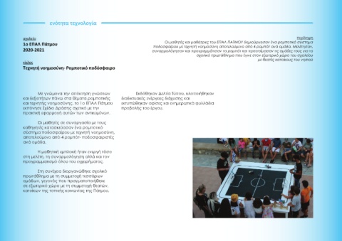1ο ΕΠΑΛ Πάτμου ποδοσφαίρου με τεχνητή νοημοσύνη αποτελούμενο από 4 ρομπότ ανά ομάδα. Μελέτησαν,