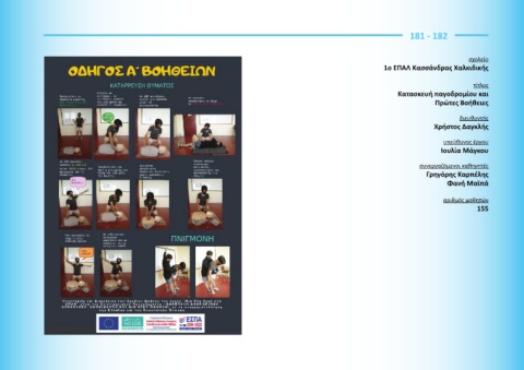 181 - 182 σχολείο 1ο ΕΠΑΛ Κασσάνδρας Χαλκιδικής τίτλος Κατασκευή παγοδρομίου και Πρώτες Βοήθειες διευθυντής Χρήστος Δαγκλής υπεύθυνος έργου Ιουλία Μάγκου συνεργαζόμενοι καθηγητές Γρηγόρης Καρπέλης Φανή Μαϊπά αριθμός μαθητών 155