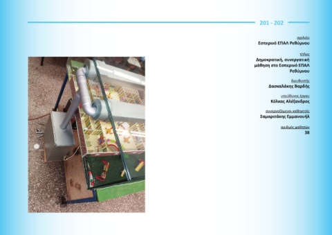 201 - 202 σχολείο Εσπερινό ΕΠΑΛ Ρεθύμνου τίτλος Δημοκρατική, συνεργατική μάθηση στο Εσπερινό ΕΠΑΛ Ρεθύμνου διευθυντής Δασκαλάκης Βαρδής υπεύθυνος έργου Κόλκας Αλέξανδρος συνεργαζόμενοι καθηγητές Σαμαριτάκης Εμμανουήλ αριθμός μαθητών 38