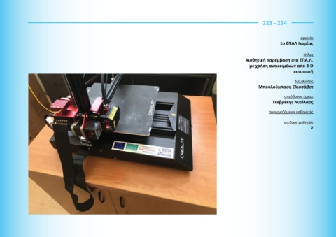 223 - 224 σχολείο 1ο ΕΠΑΛ Ικαρίας τίτλος Αισθητική παρέμβαση στο ΕΠΑ.Λ. με χρήση αντικειμένων από 3-D εκτυπωτή διευθυντής Μπουλούμπαση Ελισσάβετ υπεύθυνος έργου Γκεβρέκης Νικόλαος συνεργαζόμενοι καθηγητές αριθμός μαθητών 7