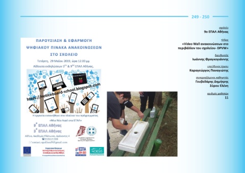 249 - 250 σχολείο 9ο ΕΠΑΛ Αθήνας τίτλος «Video Wall ανακοινώσεων στο περιβάλλον του σχολείου- DPVW» διευθυντής Ιωάννης Φραγκογιάννης υπεύθυνος έργου Καραγεώργος Παναγιώτης συνεργαζόμενοι καθηγητές Γουβεδάρης Δημήτρης Σύρου Ελένη αριθμός μαθητών 11