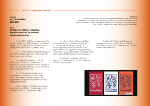 2020-2021 επιχειρηματικότητα, αλλά και ένα e-book με θέμα τη γυναίκα. Επίσης εκπονήθηκε