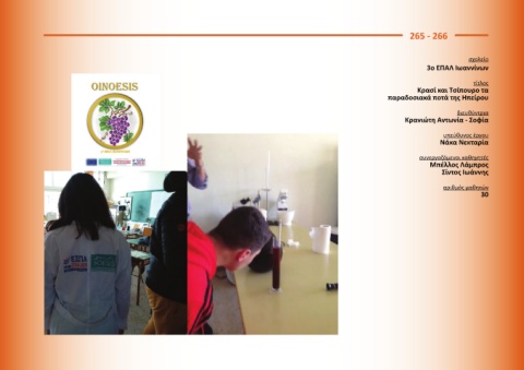 265 - 266 σχολείο 3ο ΕΠΑΛ Ιωαννίνων τίτλος Κρασί και Τσίπουρο τα παραδοσιακά ποτά της Ηπείρου διευθύντρια Κρανιώτη Αντωνία - Σοφία υπεύθυνος έργου Νάκα Νεκταρία συνεργαζόμενοι καθηγητές Μπέλλος Λάμπρος Σίντος Ιωάννης αριθμός μαθητών 30