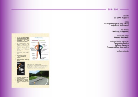 289 - 290 σχολείο 1ο ΕΠΑΛ Υμηττού τίτλος «Δυο ρόδες έχει η ζωή: Οδική ασφάλεια δικύκλων» διευθυντής Σαρέλλης Ευάγγελος υπεύθυνος έργου Ρόρρης Δαμιανός συνεργαζόμενοι καθηγητές Πετσιμέρη Ειρήνη Καΐτσου Αριστέα Γεωργοπούλου Αικατερίνη αριθμός μαθητών