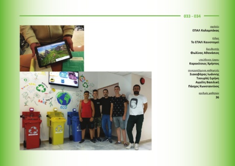 033 - 034 σχολείο ΕΠΑΛ Καλαμπάκας τίτλος Το ΕΠΑΛ Καινοτομεί διευθυντής Φωλίνας Αθανάσιος υπεύθυνος έργου Καρακίτσιος Χρήστος συνεργαζόμενοι καθηγητές Σιακαβάρας Ιωάννης Τσουρλή Ειρήνη Αγγέλη Βασιλική Πάσχος Κωνσταντίνος αριθμός μαθητών 36
