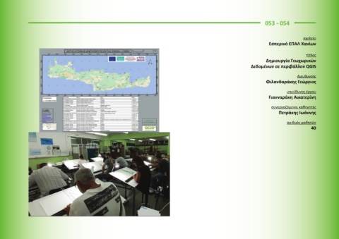 053 - 054 σχολείο Εσπερινό ΕΠΑΛ Χανίων τίτλος Δημιουργία Γεωχωρικών Δεδομένων σε περιβάλλον QGIS διευθυντής Φιλανδαράκης Γεώργιος υπεύθυνος έργου Γιανναράκη Αικατερίνη συνεργαζόμενοι καθηγητές Πετράκης Ιωάννης αριθμός μαθητών 40