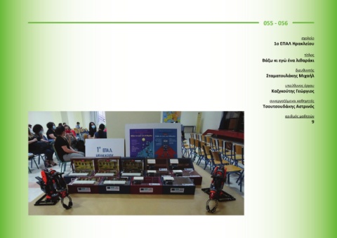 055 - 056 σχολείο 1ο ΕΠΑΛ Ηρακλείου τίτλος Βάζω κι εγώ ένα λιθαράκι διευθυντής Σταματουλάκης Μιχαήλ υπεύθυνος έργου Καζγκούτης Γεώργιος συνεργαζόμενοι καθηγητές Τσουτσουδάκης Αστρινός αριθμός μαθητών 9