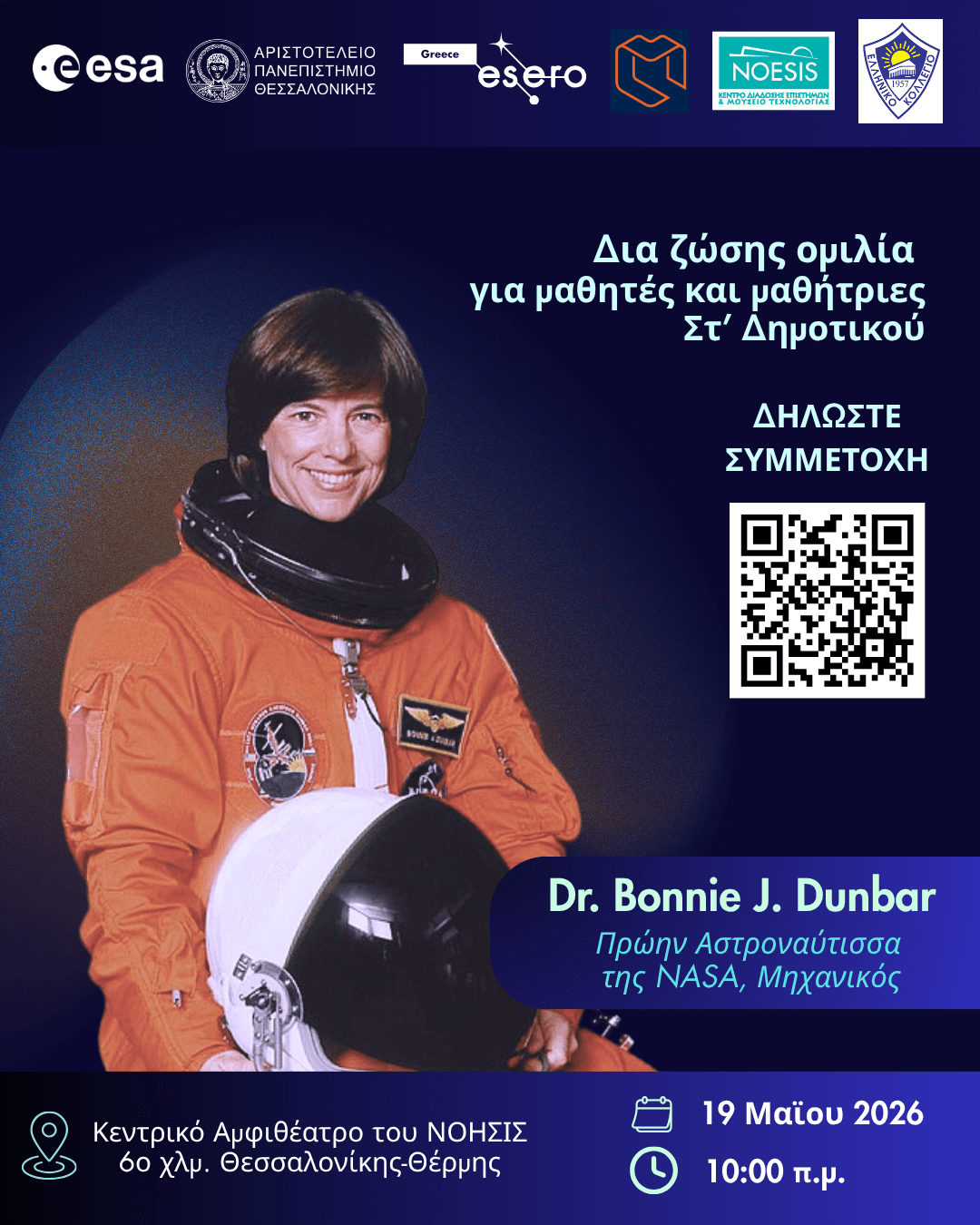 Το ESERO Greece (European Space Education Resource Office) και το Τμήμα Μηχανολόγων Μηχανικών του Αριστοτελείου Πανεπιστημίου Θεσσαλονίκης σε συνεργασία με το ΝΟΗΣΙΣ και το Ελληνικό Κολλέγιο Θεσσαλονίκης, διοργανώνουν δια ζώσης ομιλία με προσκεκλημένη την Αστροναύτισσα Dr. Bonnie J. Dunbar, η οποία απευθύνεται σε μαθητές και μαθήτριες της Στ΄ τάξης του Δημοτικού.