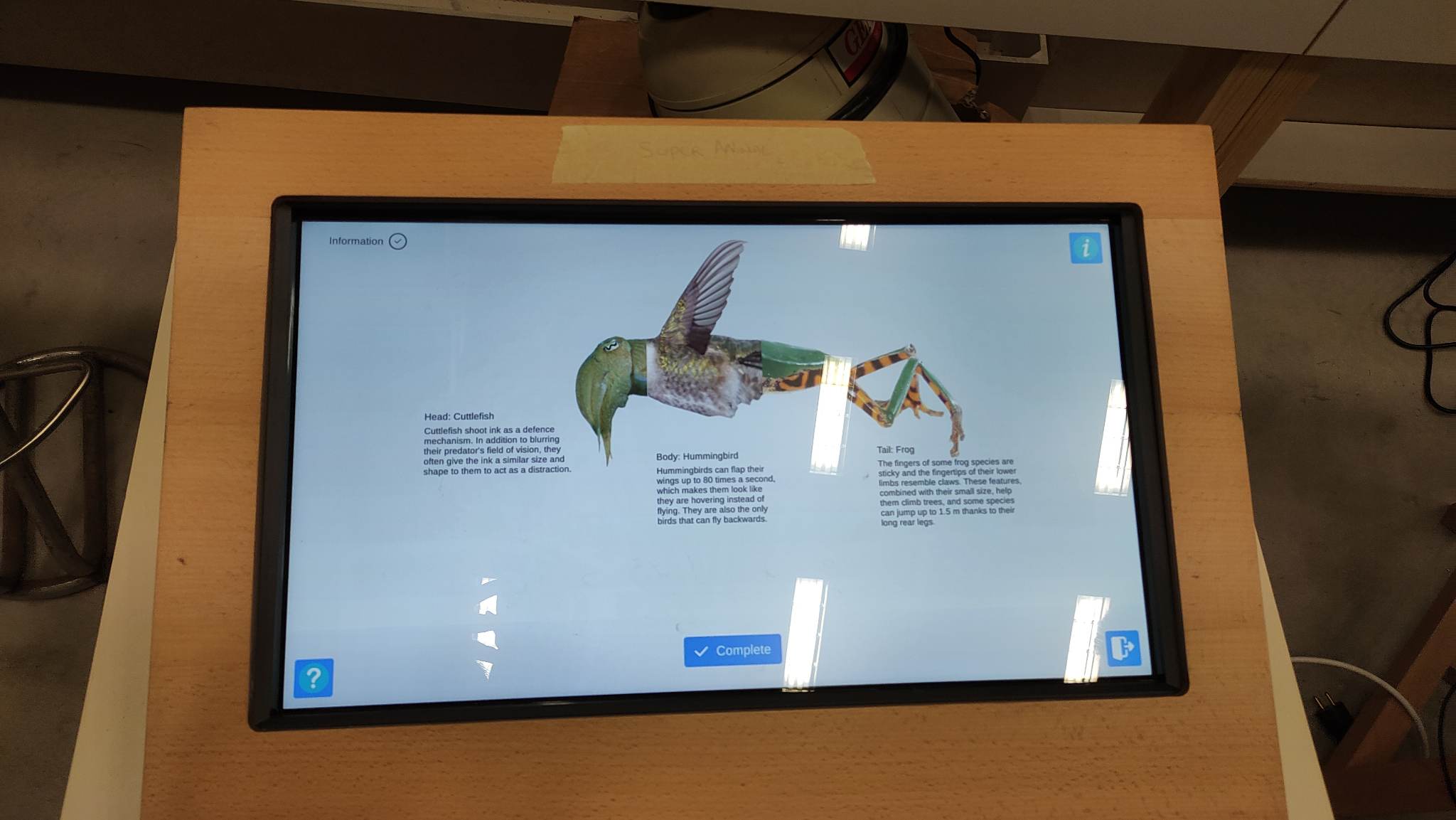 - Τρεις διαφορετικοί διαδραστικοί σταθμοί πληροφόρησης σχεδιάστηκαν ώστε να παρέχουν πληροφορίες για τα ζώα μέσα από παιχνίδια. Ο ένας σταθμός παρέχει μία ρεαλιστική προσομοίωση για τις αισθήσεις της ακοής και της όρασης σε επιλεγμένα ζώα καθώς και στοιχεία για την ανατομία τους. Ο δεύτερος σταθμός παρέχει πληροφορίες για ιδιαίτερες δυνάμεις που διαθέτουν κάποια ζώα μέσα από ένα παιχνίδι όπου ο επισκέπτης καλείται να σχεδιάσει το δικό του «υπερζώο». Στον τρίτο σταθμό πληροφόρησης ο επισκέπτης ψάχνοντας να αναγνωρίσει ενδημικά είδη της ελληνικής πανίδας ενημερώνεται για τα είδη που απειλούνται με εξαφάνιση στην Ελλάδα.