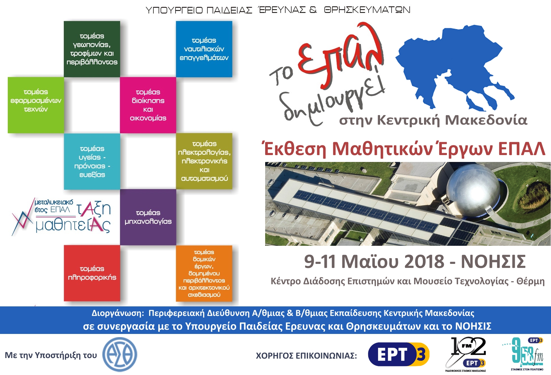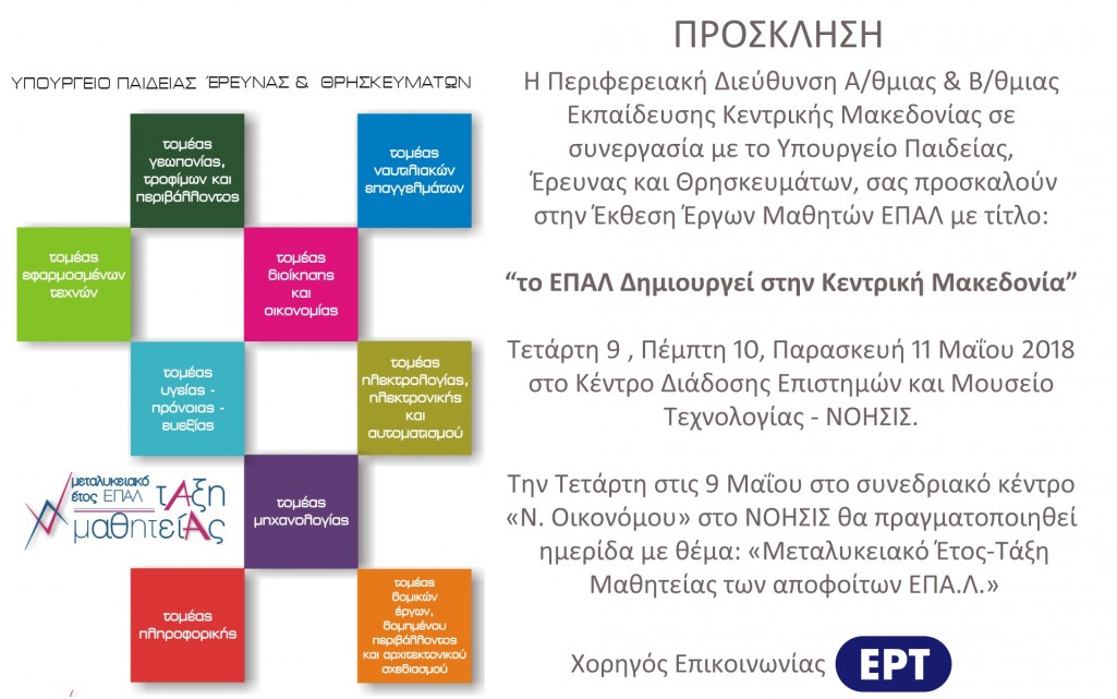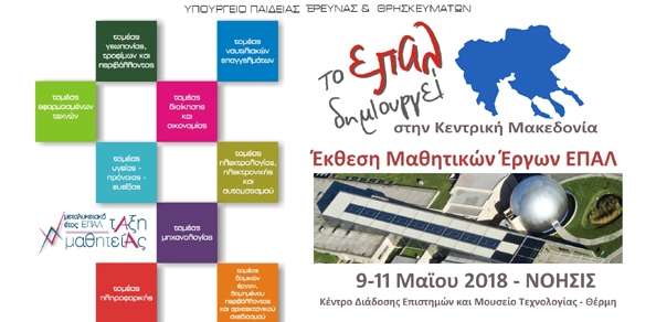 Η Περιφερειακή Διεύθυνση Εκαπίδευσης Κεντρικής Μακεδονίας σε συνεργασία με το Υπουργείο Παιδείας, Έρευνας και Θρησκευμάτων και το ΝΟΗΣΙΣ πραγματοποιεί τριήμερο εκδηλώσεων για την Επαγγελματική Εκπαίδευσης με τίτλο «Το ΕΠΑΛ Δημιουργεί στην Κεντρική Μακεδονία» στο Κέντρο Διάδοσης Επιστημών και Μουσείο Τεχνολογίας ΝΟΗΣΙΣ.