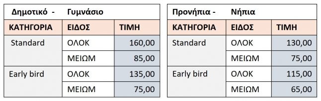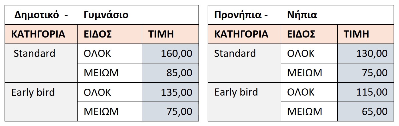 Ισχύουν ειδικές μειωμένες τιμές (early bird) για κρατήσεις μέχρι και τις 15/05 και μειωμένες τιμές για αδερφάκια και πολύτεκνες οικογένειες.