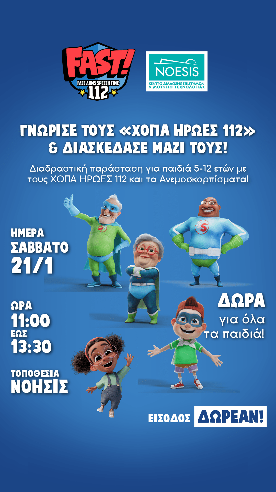 Το Σάββατο 21 Ιανουαρίου, 11.00 – 13.30, γονείς και παιδιά ηλικίας 5-12 ετών είναι καλεσμένοι στη δωρεάν διαδραστική παράσταση: «Γνώρισε τους ΧΟΠΑ Ήρωες 112, γίνε και Εσύ Ήρωας!», στο ΝΟΗΣΙΣ.