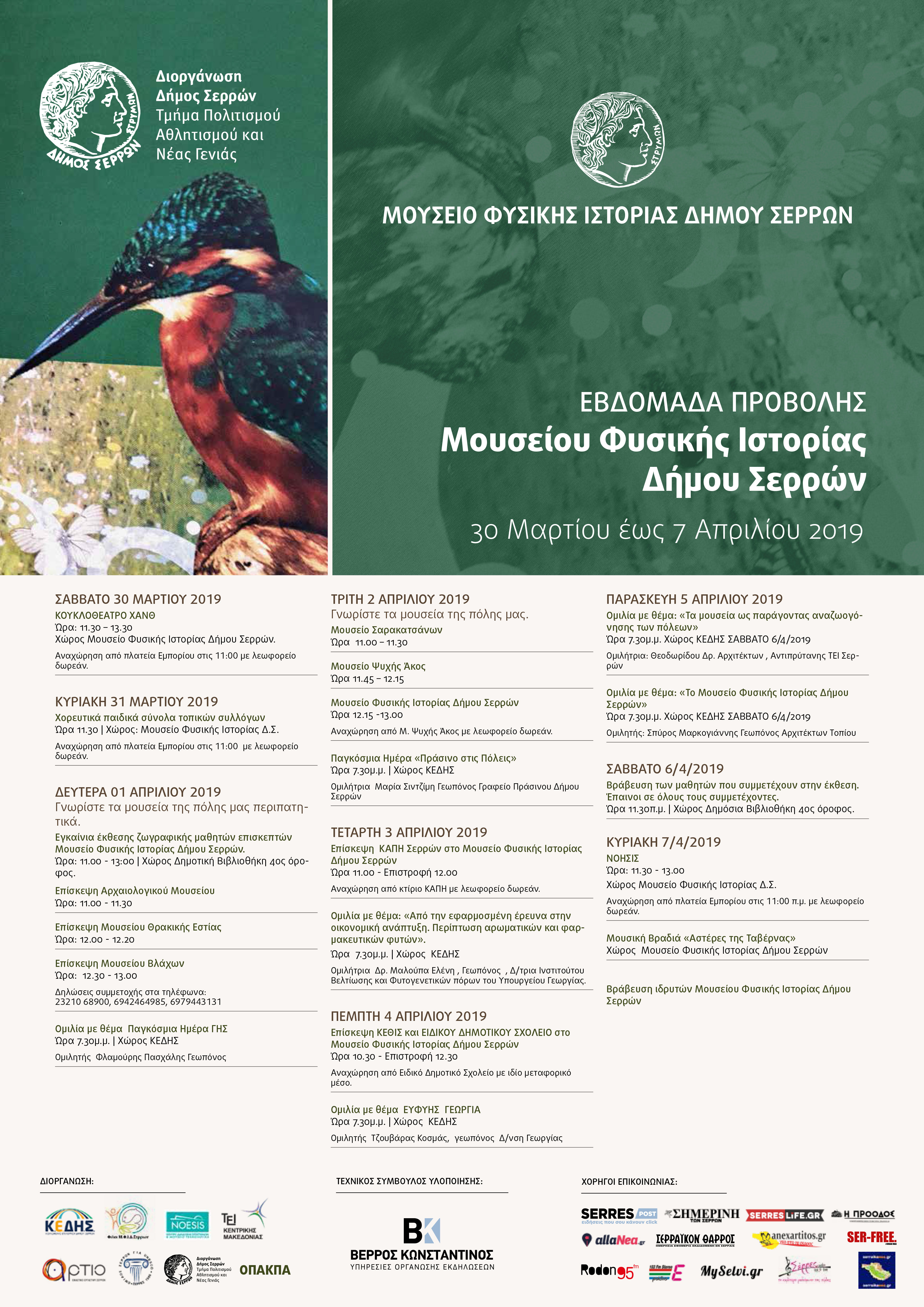 Ο Δήμος Σερρών, σε συνεργασία με διάφορους φορείς διοργανώνει την Εβδομάδα Προβολής του Μουσείου Φυσικής Ιστορίας Σερρών, από τις 30 Μαρτίου έως τις 7 Απριλίου 2019. Με πολλές και σημαντικές εκδηλώσεις προβάλλεται η σπάνια συλλογή του Μουσείου Φυσικής Ιστορίας, παράλληλα με άλλα σημαντικά λαογραφικά μουσεία της πόλης των Σερρών. Στο πλαίσιο των εκδηλώσεων θα πραγματοποιηθούν ομιλίες και δράσεις με στόχο την ενημέρωση και ευαισθητοποίηση των πολιτών σε θέματα περιβάλλοντος.