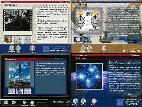Οθόνες από τις εφαρμογές πολυμέσων που αναπτύχθηκαν από το Εργαστήριο Επεξεργασίας Πληροφορίας και Υπολογιστών του Α.Π.Θ. για το Τεχνικό Μουσείο Θεσσαλονίκης.