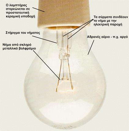 Οι πλέον συνηθισμένοι είναι οι λαμπτήρες πυράκτωσης. Αυτοί έχουν ένα λεπτό νήμα από βολφράμιο, το οποίο θερμαίνεται από ηλεκτρικό ρεύμα μέχρι να αρχίσει να ακτινοβολεί λευκό φώς (λευκοπύρωση). Το νήμα βρίσκεται μέσα σε ένα γυάλινο δοχείο απ’ το οποίο έχει αφαιρεθεί ο αέρας και στη θέση του έχουμε κάποιο αδρανές αέριο (αργό, άζωτο κ.λ.π). Το αέριο αυτό βοηθά στο να μην καίγεται εύκολα το νήμα.